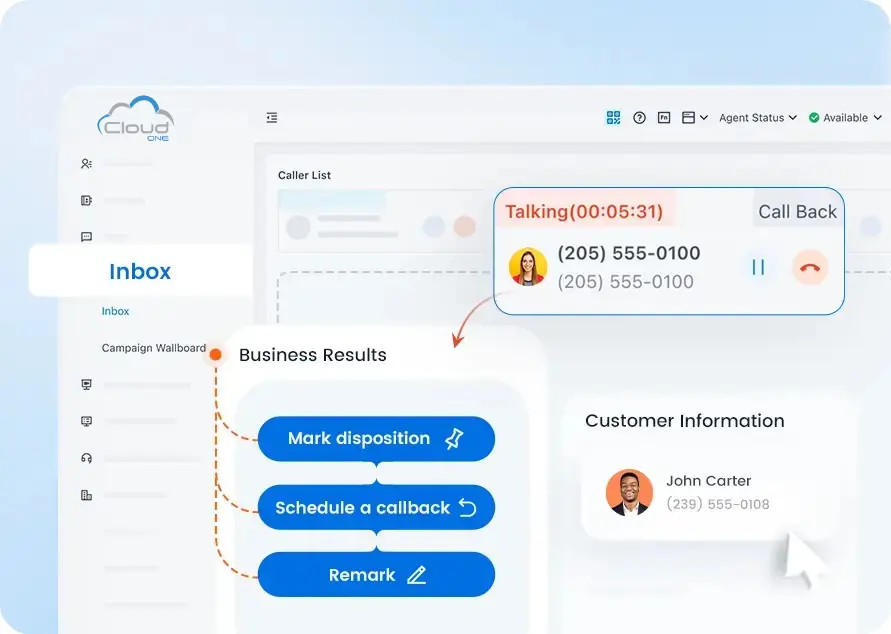 To maximize efficiency in outbound operations, especially relevant for businesses scaling, equip your outbound queue agents with a unified and user-friendly interface that streamlines their tasks. The Call Inbox creates a specialized area where agents can oversee all their outbound calls, modify their status, and execute call functions such as answering or hanging up — all with just a few simple clicks.