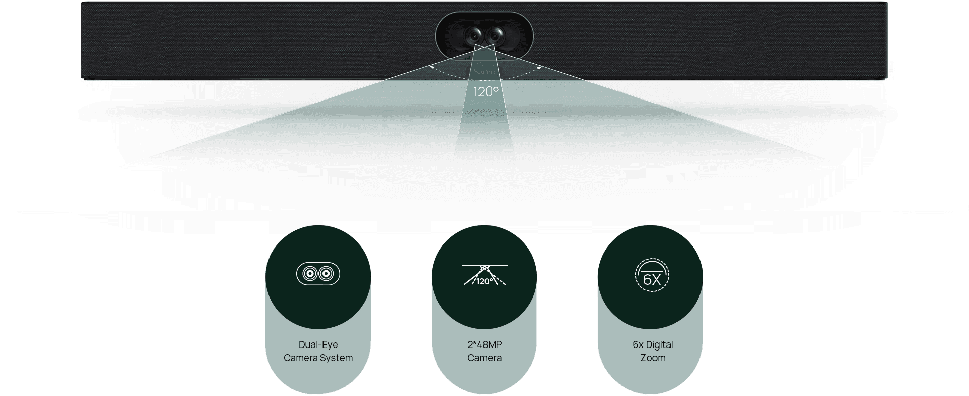 The Yealink SmartVision 40 is an all-in-one intelligent conference camera designed for small to medium-sized meeting spaces. It features dual-eye 48MP cameras that deliver sharp and detailed visuals, ensuring everyone in the room is clearly visible. The SmartVision 40's AI-powered IntelliFocus automatically keeps the speaker in focus, while Video Fence restricts the view to the meeting space for added privacy.